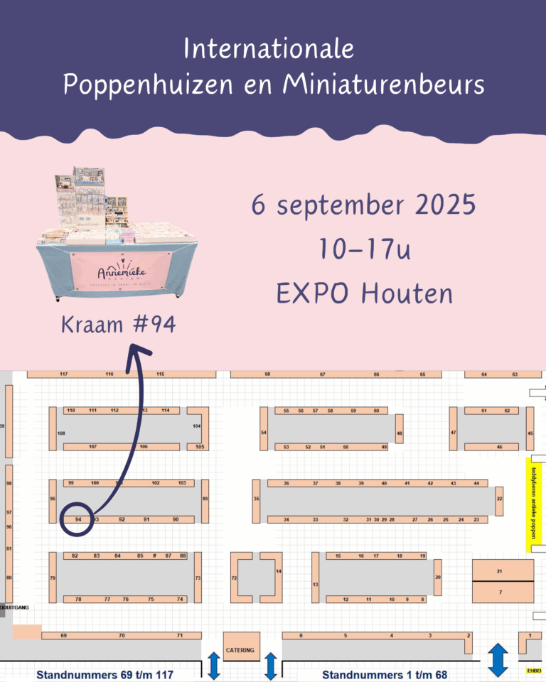 Het weekend van 7 en 8 september komt er al snel aan! Dan sta ik met een kraam op de Poppenhuizen- en Miniaturenbeurs in Houten. Ik ben druk bezig met de laatste voorbereidingen. Dit is mijn eerste beurs, ik heb er zin in! 6 september zal ik de kraam opbouwen. Je kunt de kraam herkennen aan de grote banner met Annemieke Design. Tot dan!